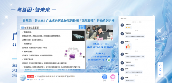 10 月 24 日,作為廣東省獸醫(yī)系統(tǒng)基因檢測(cè) “強(qiáng)基提質(zhì)” 行動(dòng)系列培訓(xùn)的關(guān)鍵一環(huán),第二期線上培訓(xùn)順利舉辦。出席本次培訓(xùn)的領(lǐng)導(dǎo)有廣東省動(dòng)物疫病預(yù)防控制中心副主任盧受昇高級(jí)獸醫(yī)師,培訓(xùn)由廣東省動(dòng)物疫病預(yù)防控制中心王福廣進(jìn)行主持,特邀廣東省動(dòng)物疫病預(yù)防控制中心胡辛凱、鐘文霞兩位一線技術(shù)骨干授課,全省各級(jí)獸醫(yī)實(shí)驗(yàn)室技術(shù)人員、基層防疫骨干積極參與,線上峰值觀看人數(shù)超 1900+ 人。